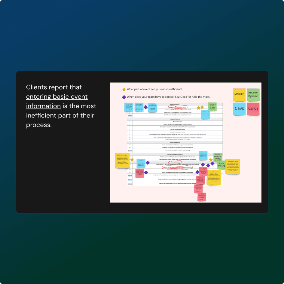 SeatGeek was using extensive internal resources to set up client events that should’ve been self-serve. As lead UX researcher, I interviewed major clients and shadowed support teams, uncovering redundant workflows and a client preference for human setup. The insights drove a support reorg and a new event setup UX that product squads prioritized in 2023.